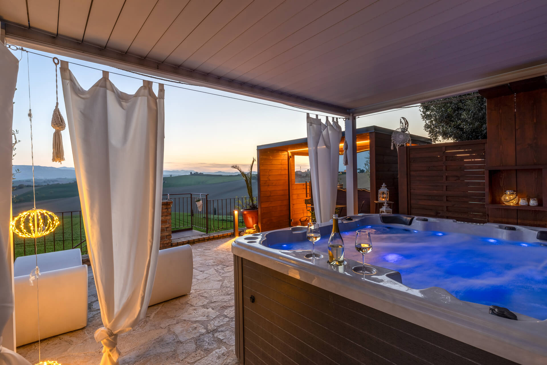 Un immenso giardino con piscina panoramica, BBQ con cucina esterna e varie zone relax. La piscina è aperta da maggio ad ottobre.